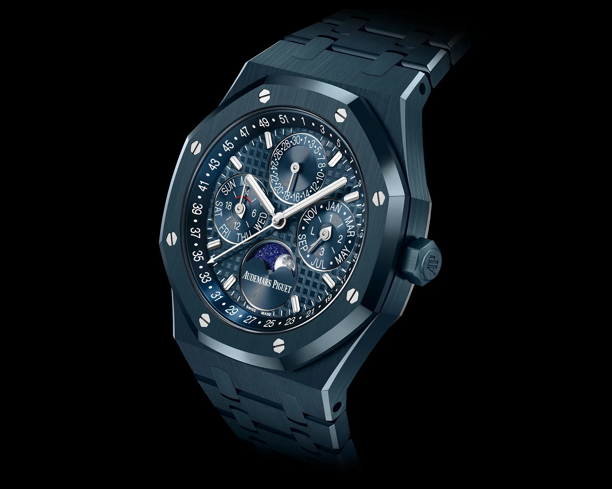Openworked perpetual calendars with crown-only correction systems continue AP’s push toward complications that fit into daily routines. Malachite dials and deep “Bleu Nuit, Nuage 50” ceramic cases lean into material and color without asking for much explanation.