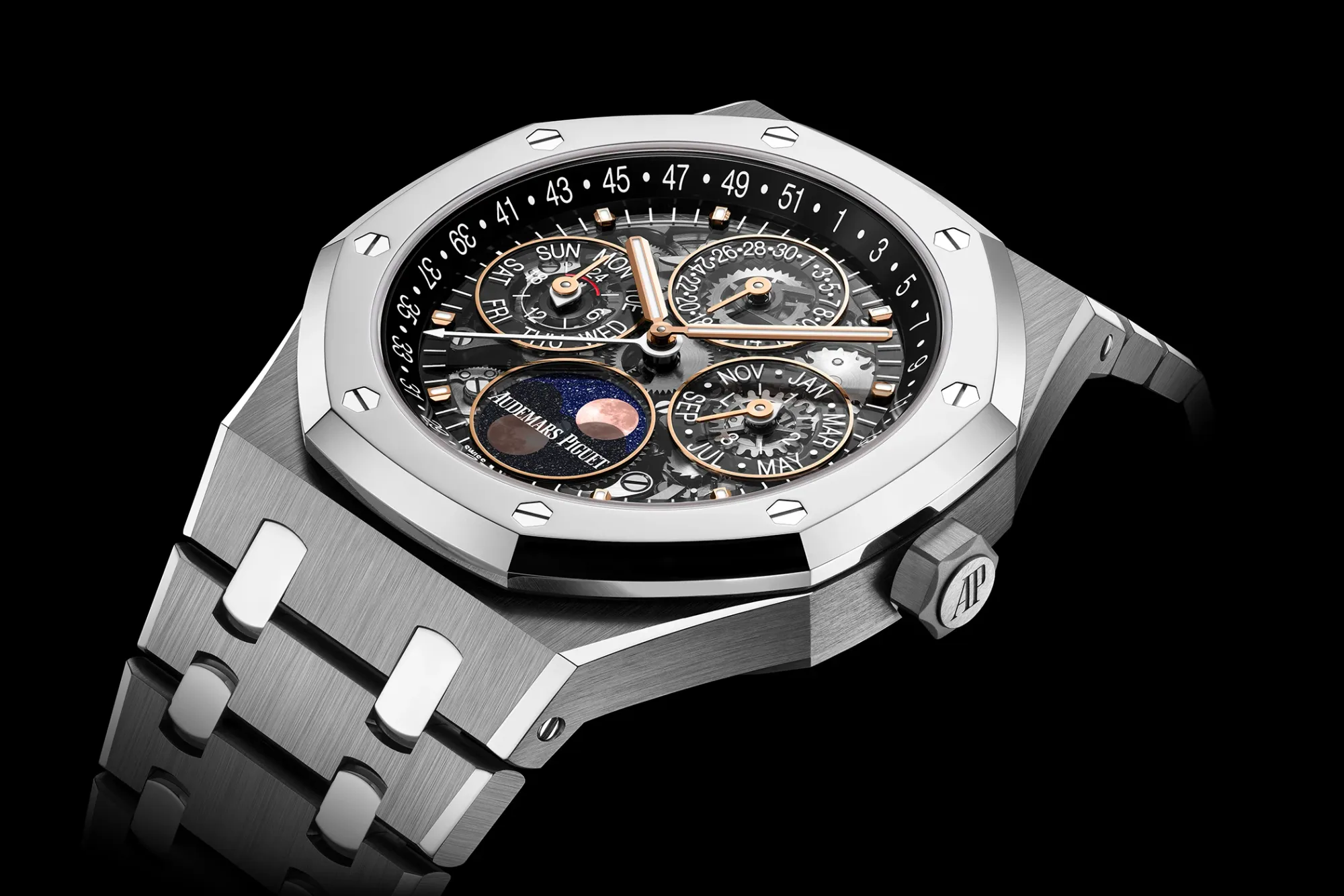 Placed next to the rest of the 2026 lineup, the contrast is easy to spot. Skeletonized Royal Oaks in titanium with Bulk Metallic Glass bezels strip familiar forms down to their structural core.