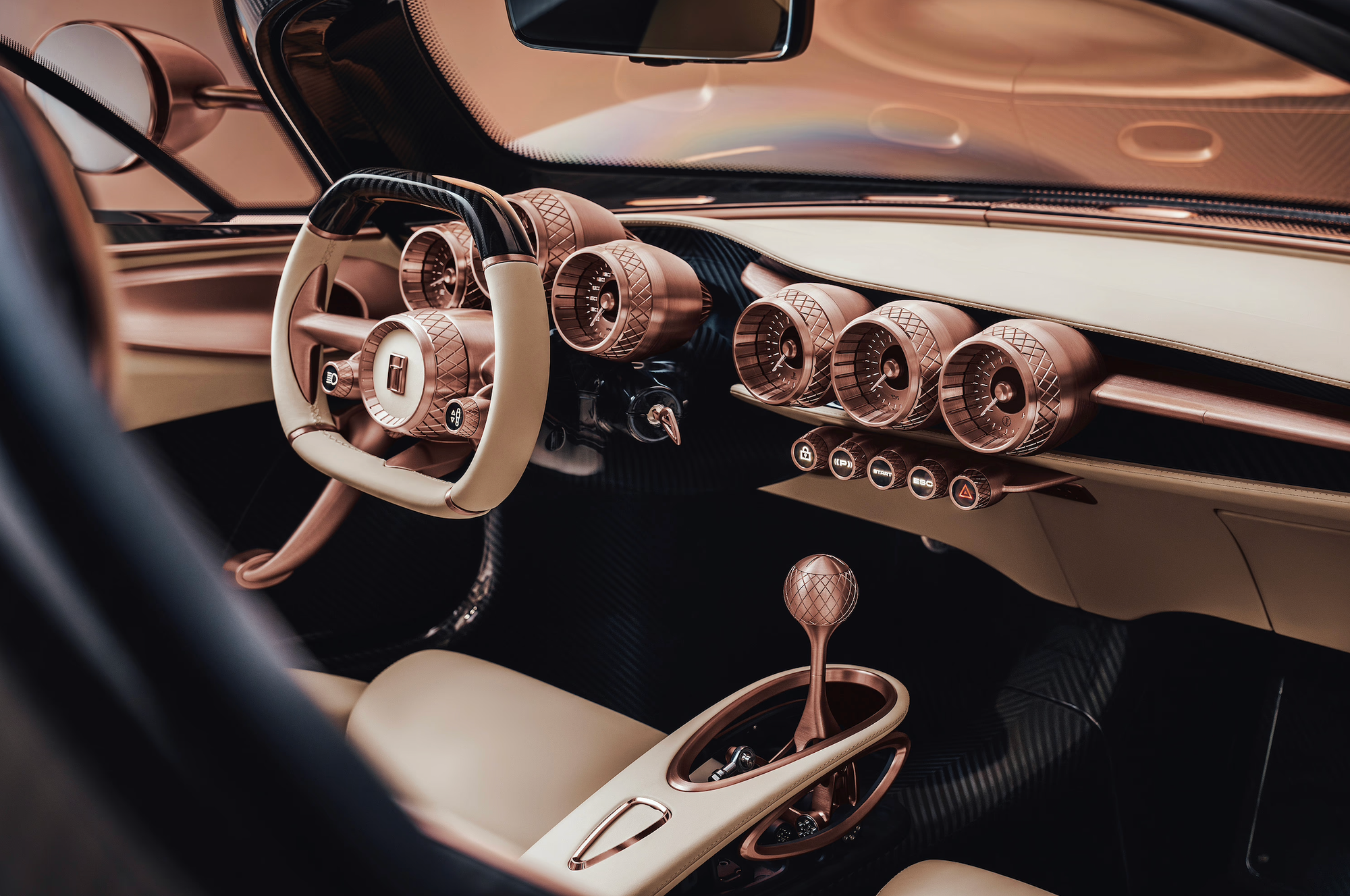 That philosophy becomes unmistakable once you step inside. The P72’s interior is deliberately analog. There’s no central screen, no infotainment theater, no selectable personalities. Instead, you’re surrounded by machined aluminum switchgear, quilted leather, and a set of jewel-like analog dials. The exposed linkage shifter sits proudly at the center, part tool, part sculpture. In 2026, that choice feels almost confrontational.