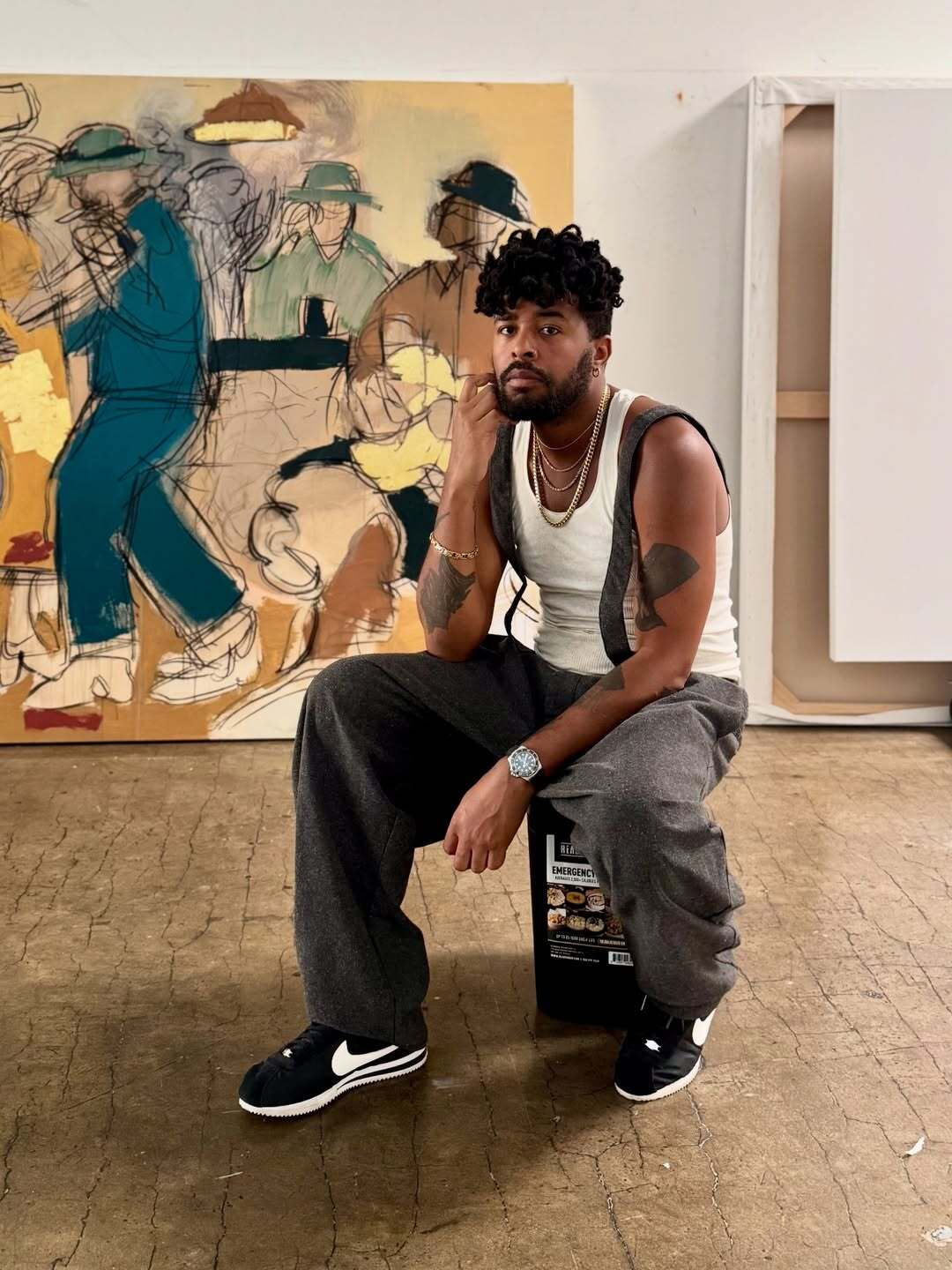 Gold, for Sheppard, isn’t a signal. It’s material history. Rare because it’s been recycled for thousands of years. Pulled from the earth. Carried forward. That thinking mirrors his paintings, where gold leaf catches light not as decoration, but as presence. The same instinct draws him to quiet dress watches like his Patek Philippe Calatrava. Objects that don’t announce themselves. Objects that reward attention.