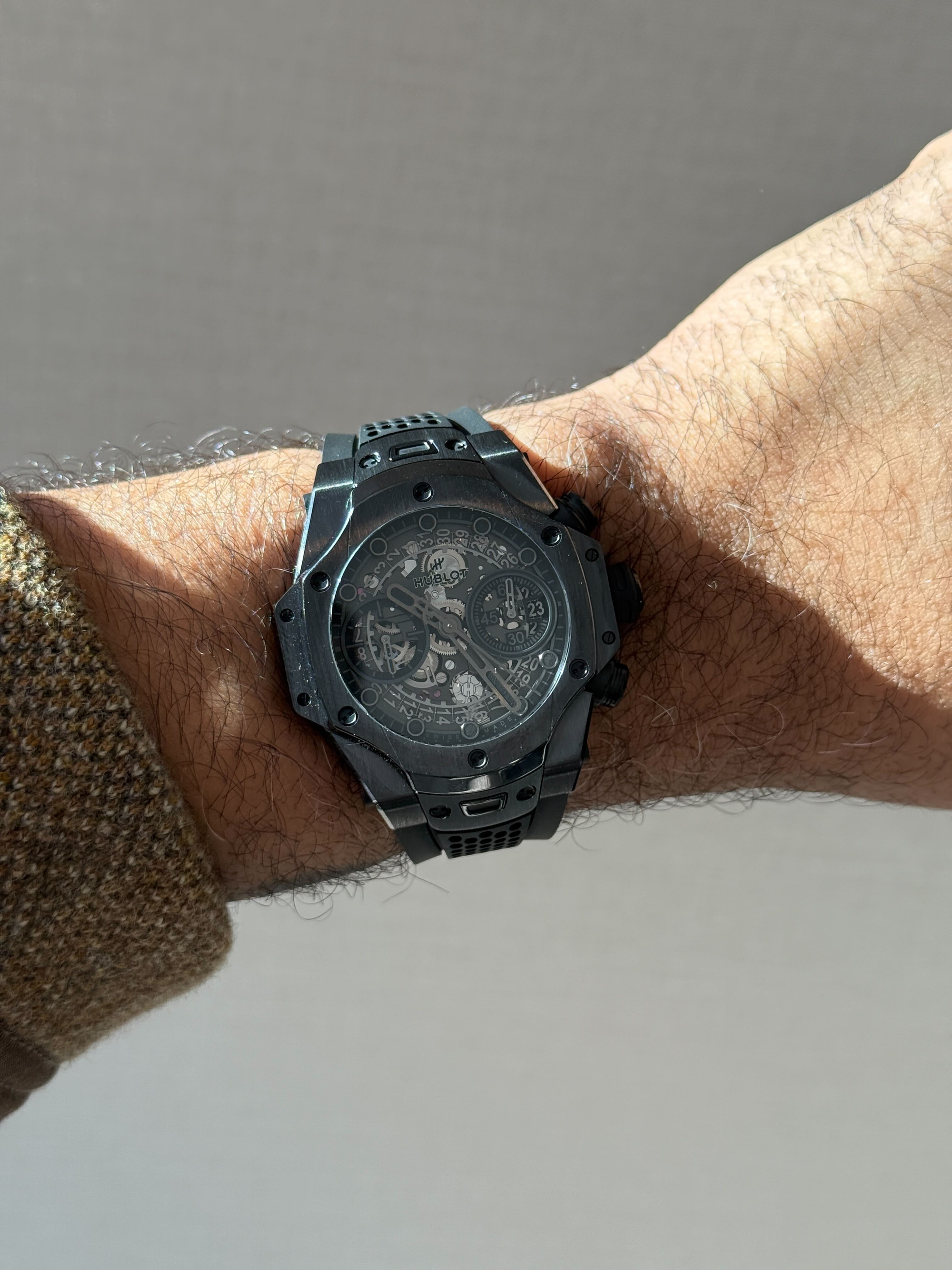 Inside, Hublot’s HUB1280 Unico flyback chronograph is skeletonized with intention. The column wheel is visible from the dial side, the date track is integrated rather than imposed, and the overall effect feels engineered rather than styled. At $31,200, the watch still sits firmly in luxury territory, but it no longer reads like a concept car. It reads like something Ross would actually wear, which is exactly why it works.