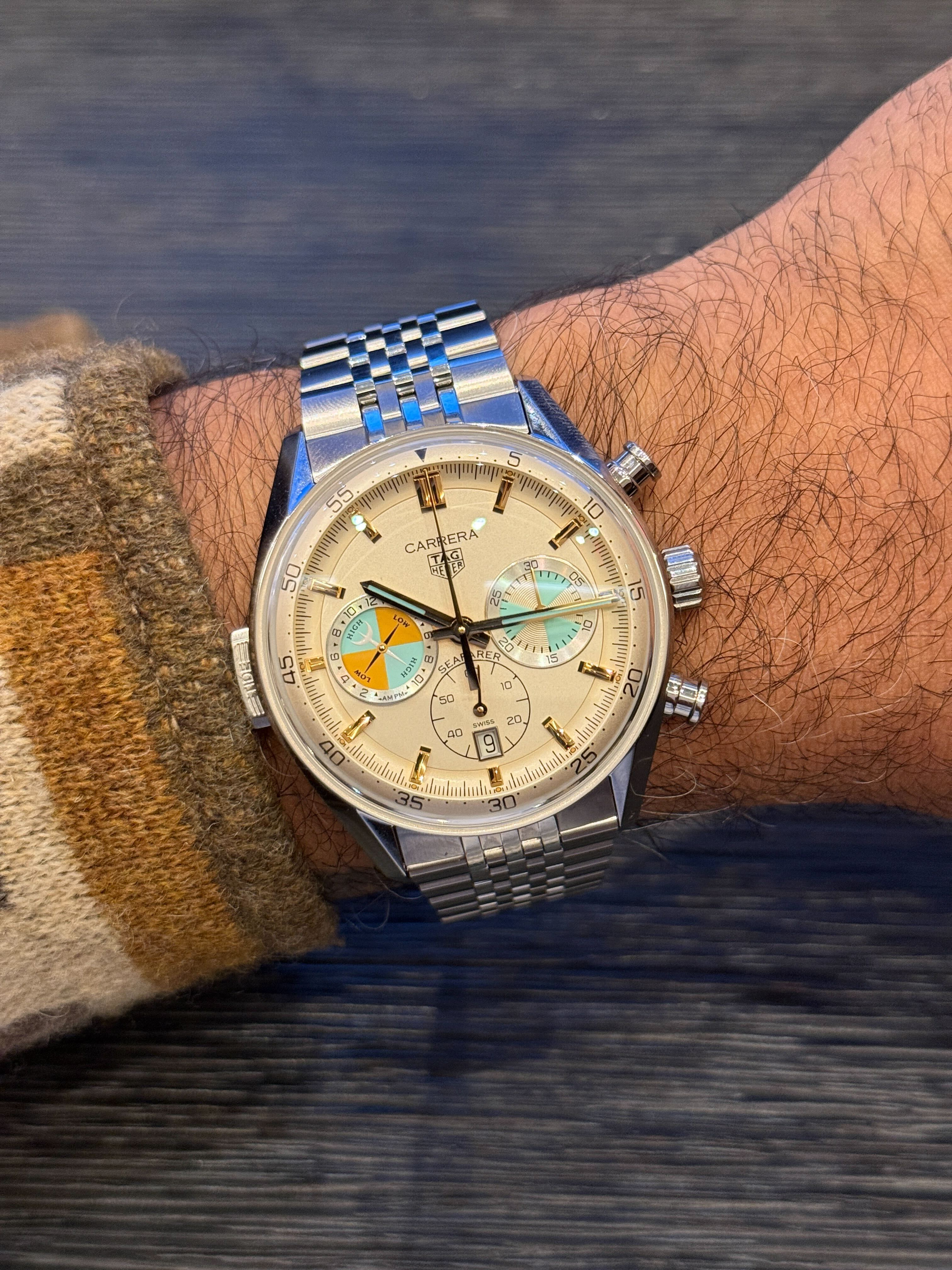 On the wrist, the seven-row beads-of-rice bracelet does a lot of the work. It grounds the watch in a specific visual language that feels more Nantucket than paddock. This is the kind of watch you could wear sailing, but just as easily nowhere near a boat. With a knit polo. Maybe an old Abercrombie reference tee. The point is that TAG Heuer isn’t chasing performance credibility here. It’s leaning into lifestyle, and doing so with enough historical backing that it never feels forced.