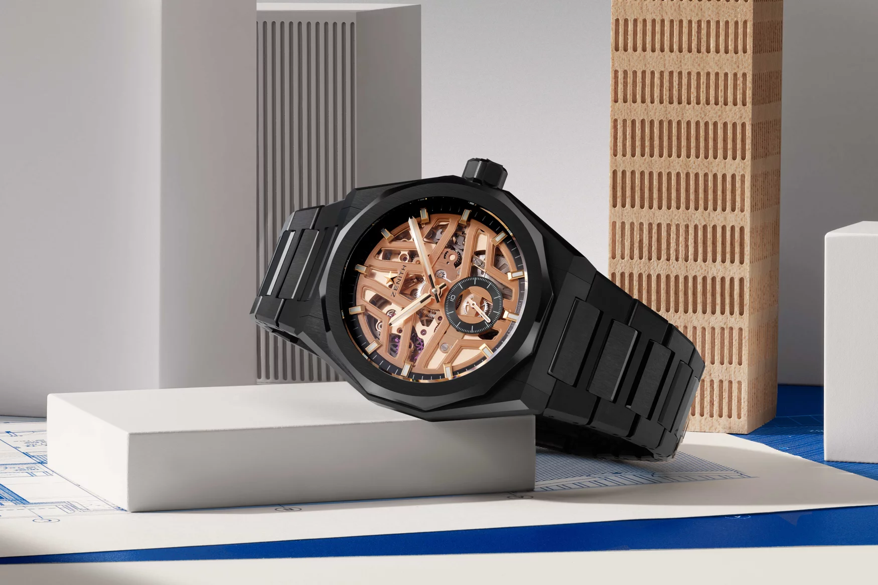 The Zenith Defy Skyline Skeleton in black ceramic crystallizes that approach. Black ceramic has a way of draining excess drama out of a watch, and here it turns what could have been pure spectacle into something architectural. The 41mm case and integrated bracelet feel deliberately monolithic, almost moody, while the gold-toned openworked movement underneath introduces contrast without noise.