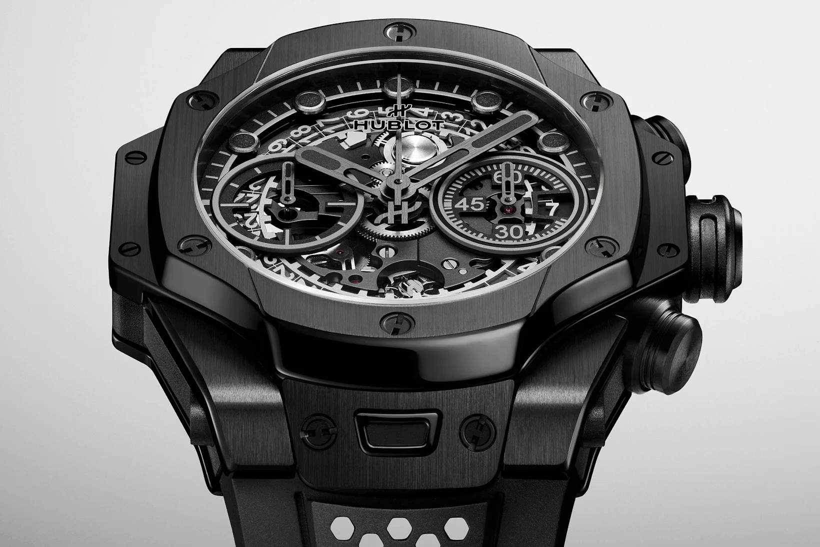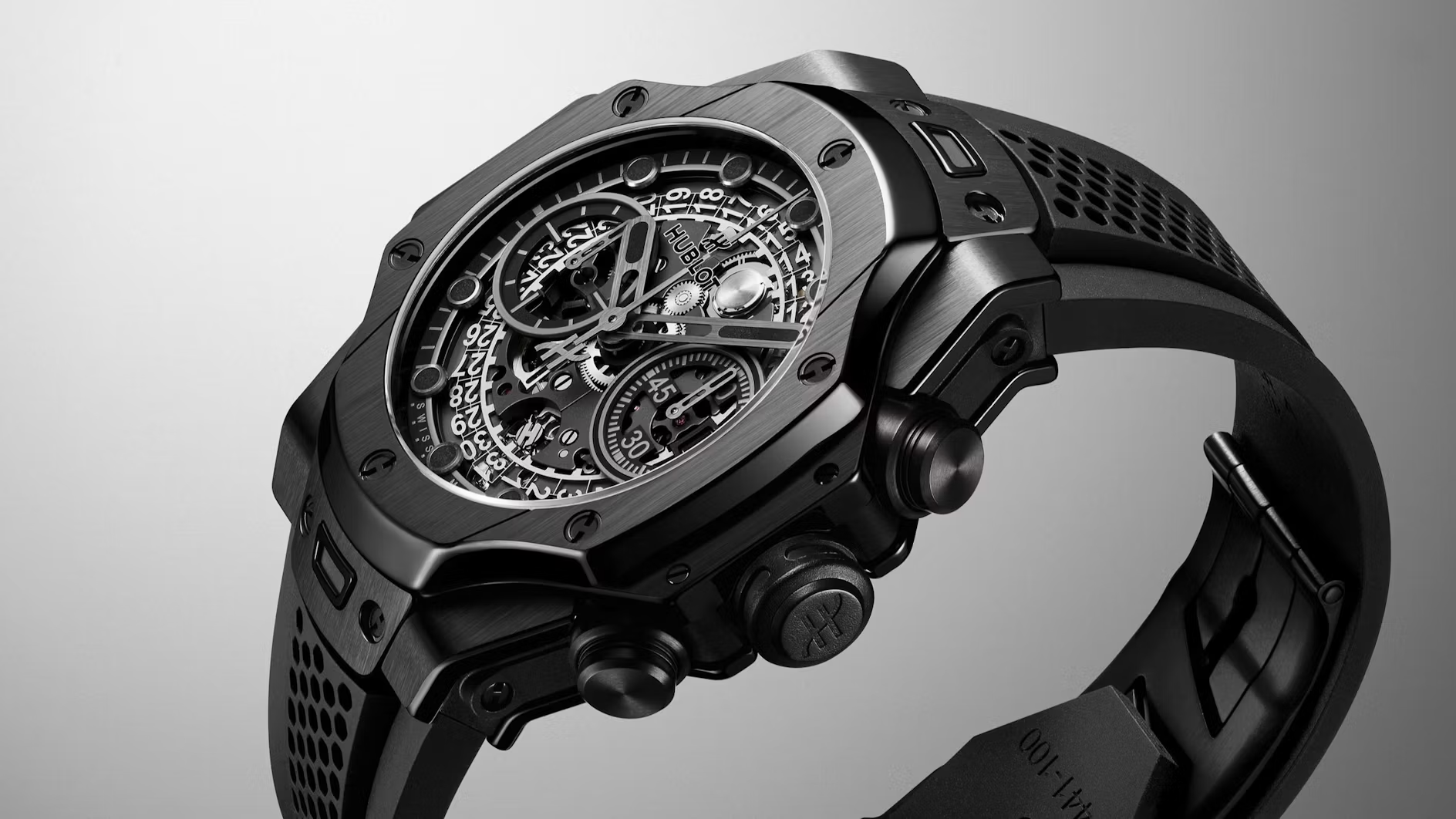 Ross doesn’t design objects so much as systems, and that mindset translates unusually well to watchmaking. The 42mm black ceramic case carries over the elongated, layered silhouette he established with the earlier tourbillons, but strips back some of the visual theatrics in favor of clarity. The honeycomb motif shifts from the case to the structured rubber strap, reducing visual weight while keeping the design coherent.