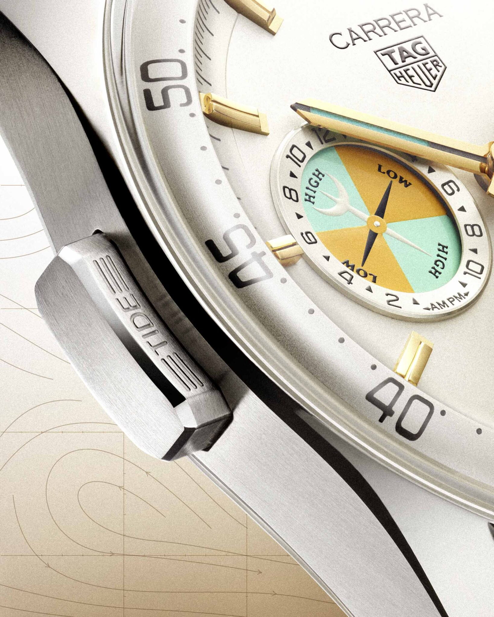 The modern execution keeps things practical without overplaying it. A 42mm stainless-steel case uses TAG Heuer’s glassbox Carrera architecture, with a domed sapphire crystal and bezel-less profile that keeps the dial open and legible. The tide indication at nine o’clock, adjusted via a dedicated pusher labeled “TIDE,” feels almost anachronistic in the best way. Useful if you’re actually near water, but just as compelling as a reminder that not every complication needs to justify itself through daily utility.