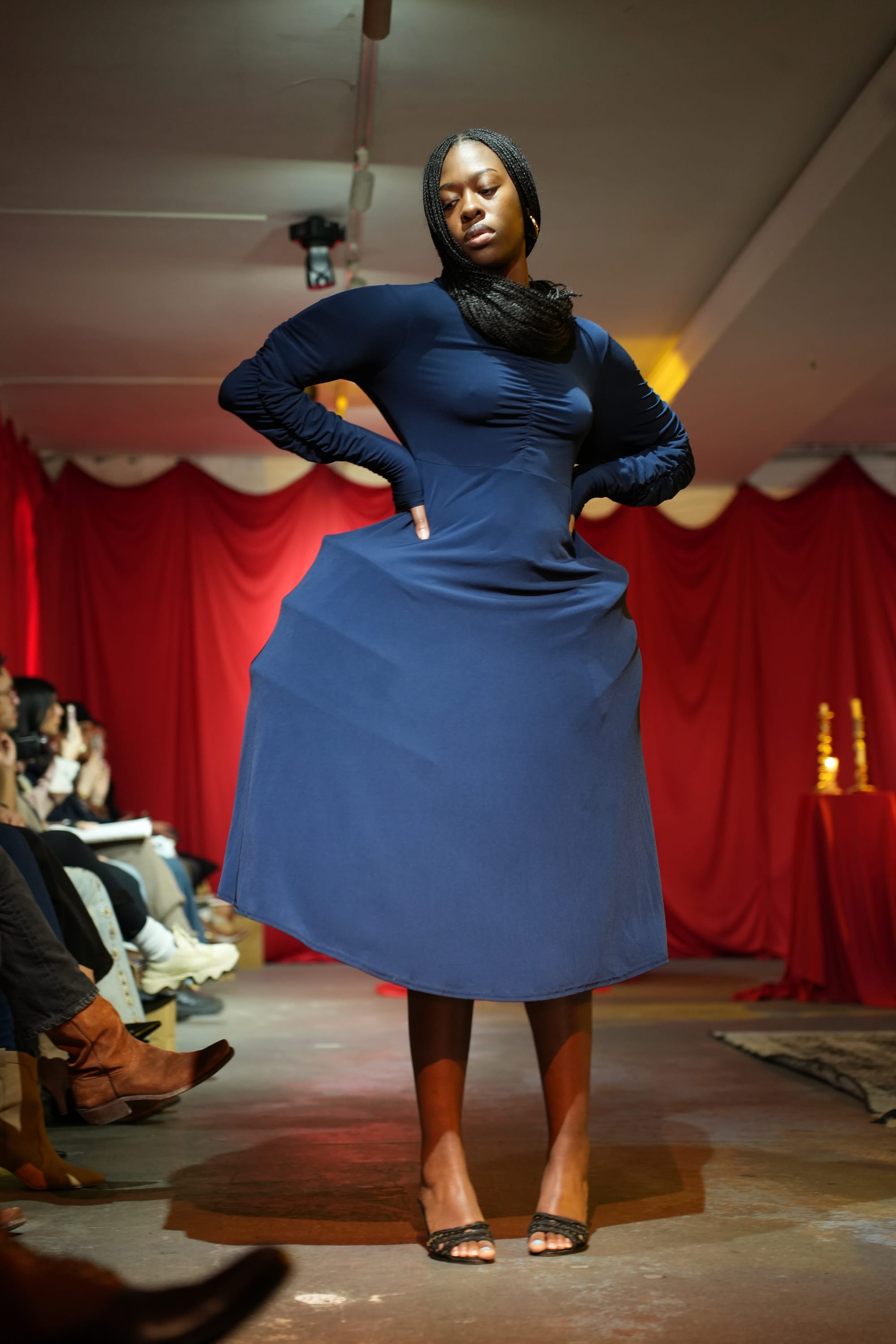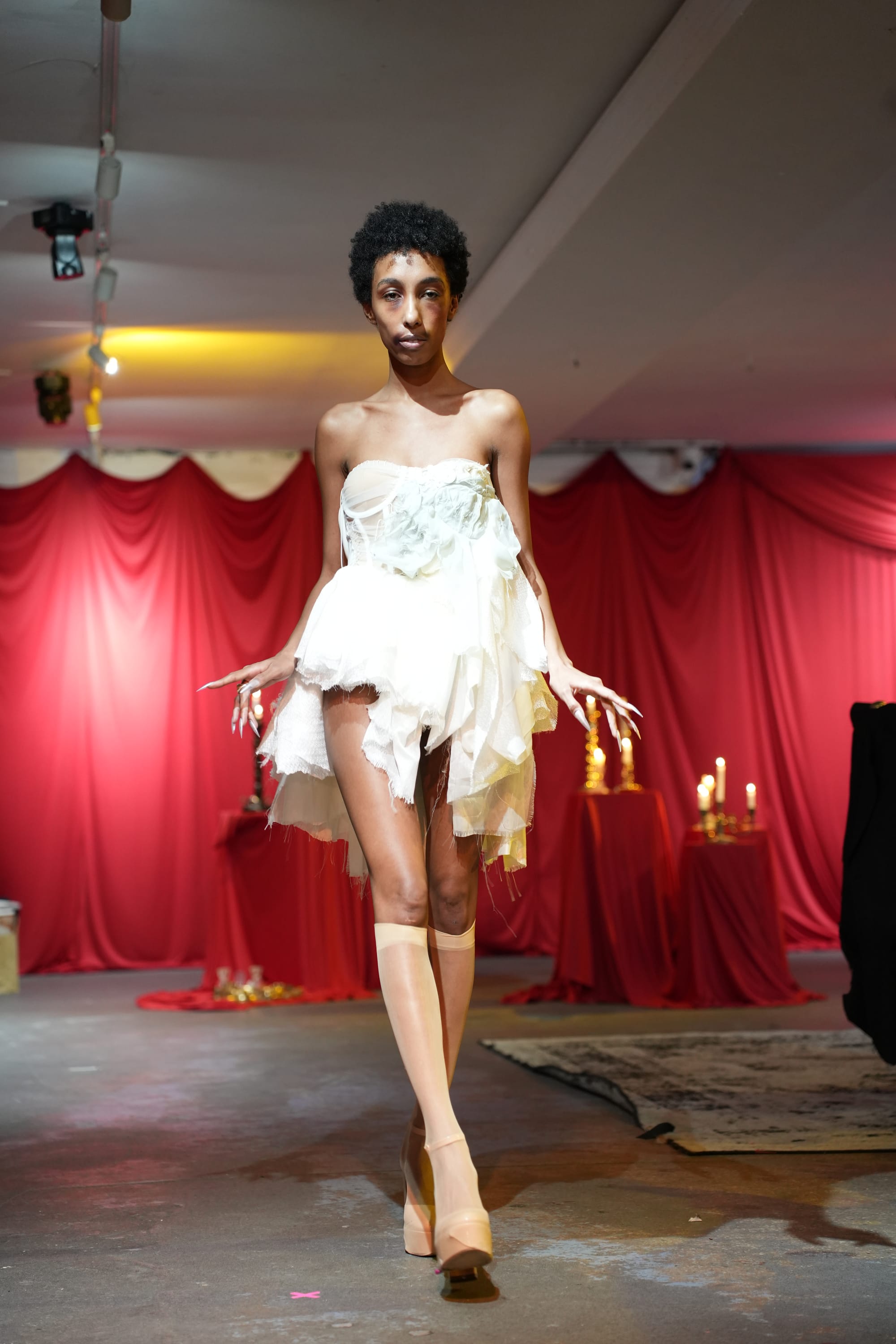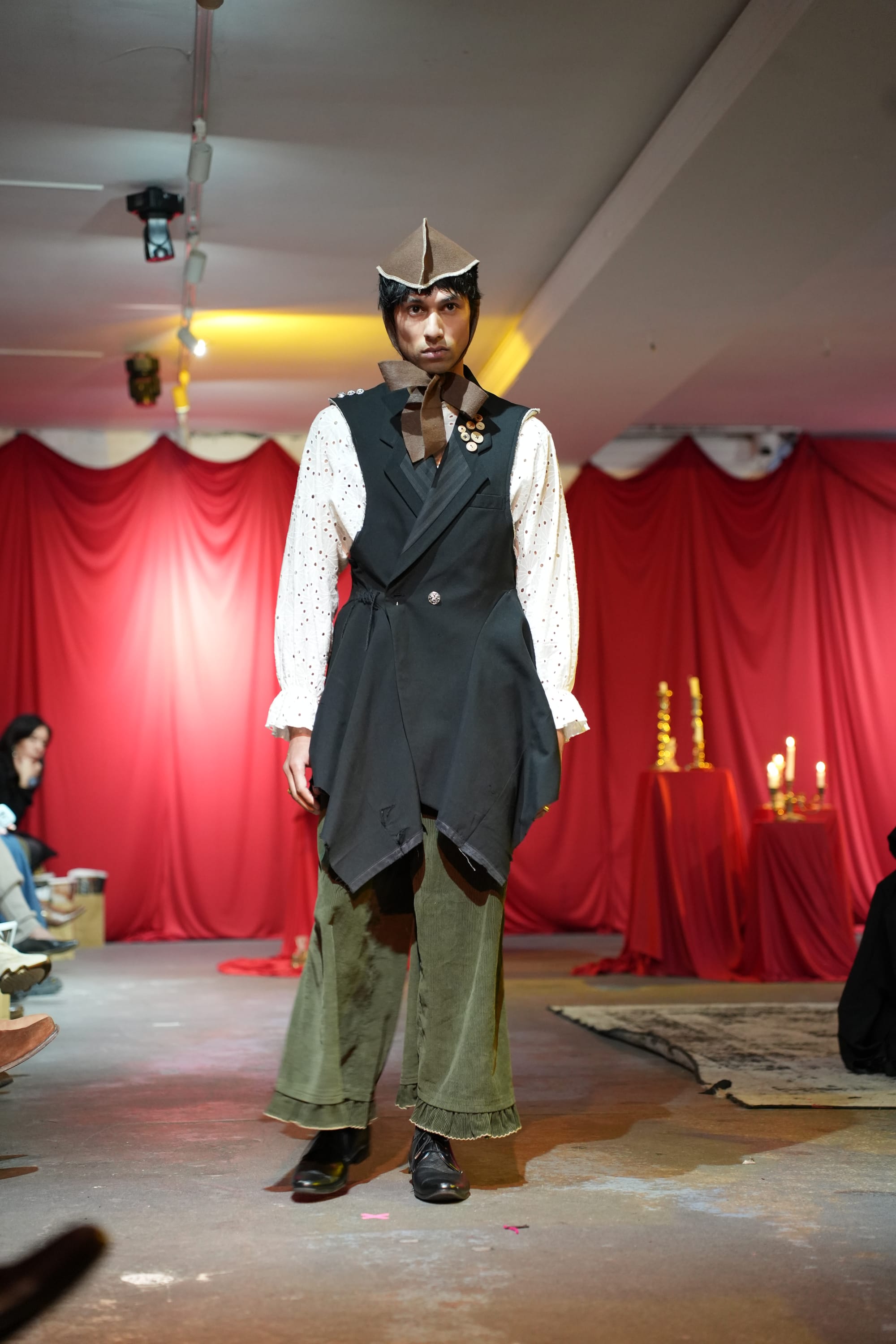 When the show began, the vision crystallized quickly. The runway unfolded like a slow tableau, models moving deliberately through the space like sculptural apparitions. The garments carried their own presence. The focus was never the models themselves. They felt more like vessels carrying the spirit of characters only Menyelek fully knows, though the audience could sense them.