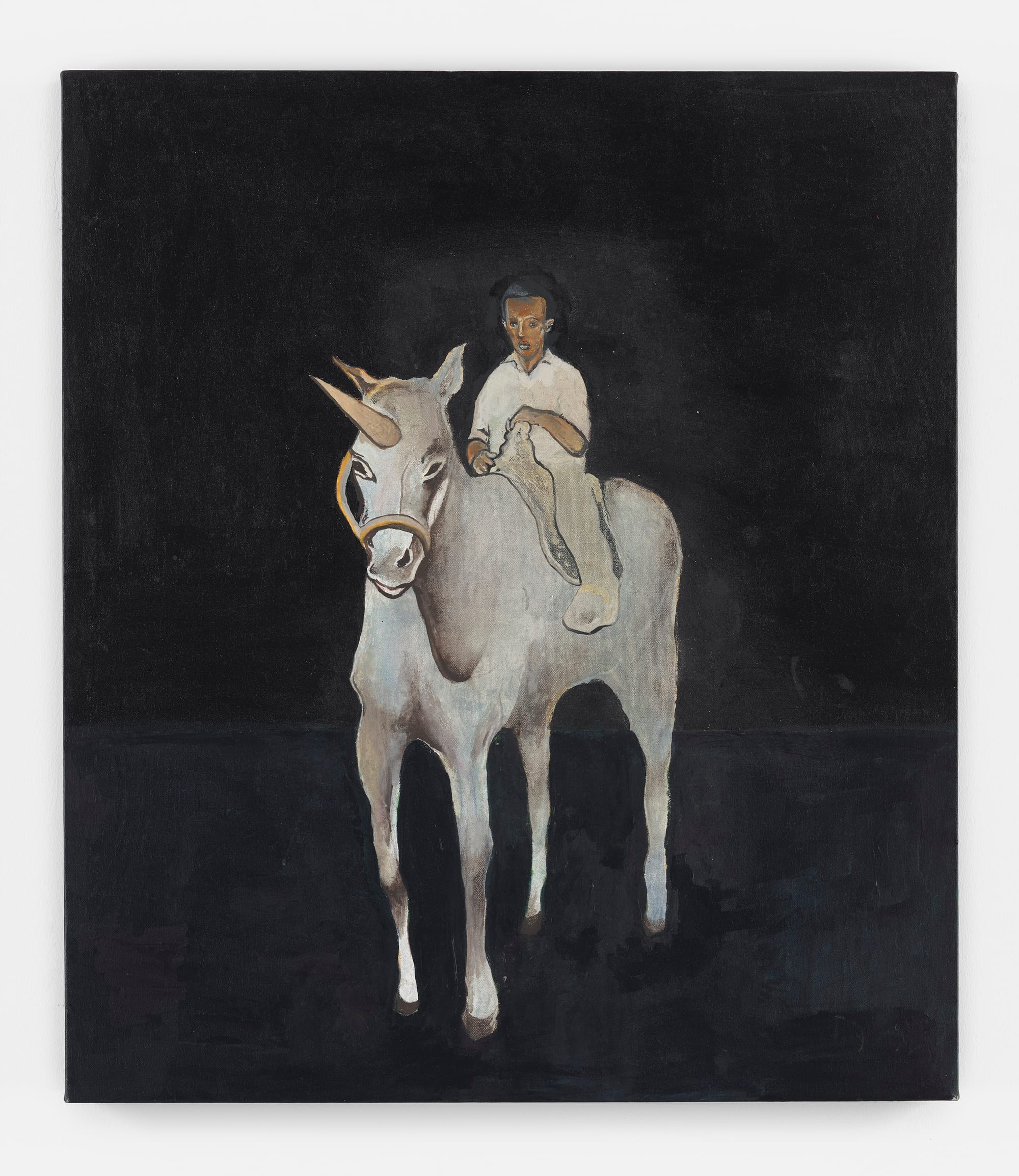 What that looks like, in practice, is painting that doesn't behave. His canvases slip between styles mid-composition—realist here, nearly abstract there—and refuse to settle into any single mood. 40 Acres and a Unicorn (2007), one of the show's earliest works, depicts a Black figure astride a white unicorn against a pitch-black ground. It's funny and mournful at the same time, which is a very hard thing to pull off. The title is a direct reference to the Reconstruction-era promise of land and economic autonomy made to formerly enslaved people after the Civil War—a promise that was almost immediately broken. Davis takes that history and tilts it sideways, into something that feels more like a dream than a lesson.