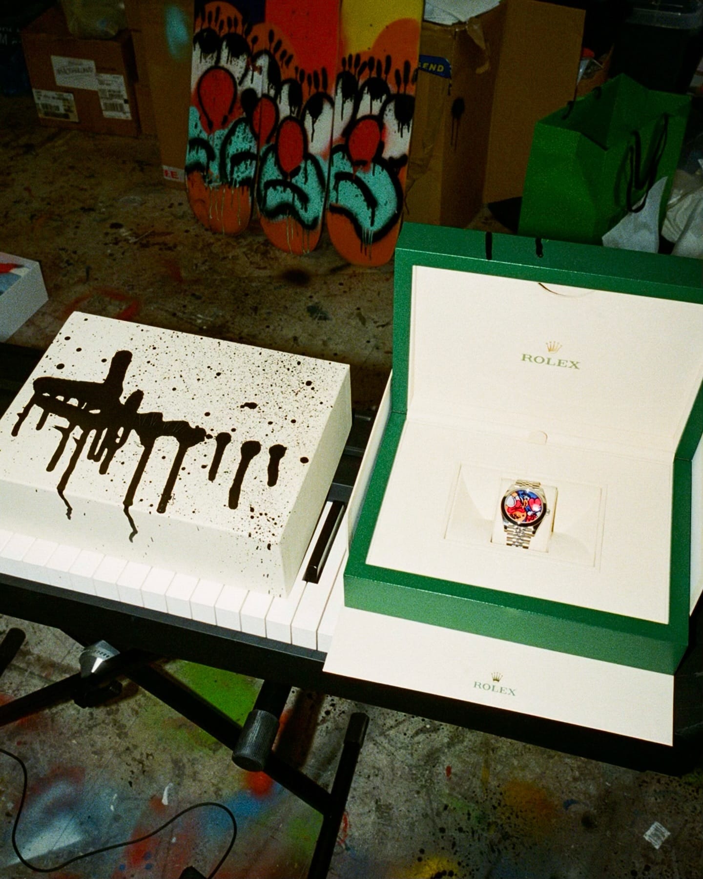 That curiosity drives his most controversial work. When he customized a Rolex Day-Date, better known as the Presidential, and replaced its dial with one of his painted characters, purists called it blasphemy. But it made perfect sense. A Rolex is supposed to be untouchable. Slawn wanted to see what happens when you touch it anyway. He’s been compared to Basquiat for his chaos and to Banksy for his irreverence, but what he’s really doing is flipping the power dynamic. Who decides what’s sacred? Who gets to participate?